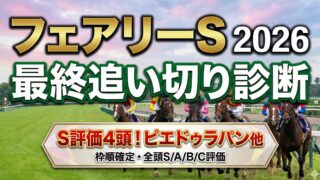 重賞 【フェアリーS2026】最終追い切り評価S/A/B/C|美浦W&坂路の動きで格付け フェアリーS(2026/1/11 中山芝1600m)の最終追い切りをS/A/B/Cで格付け。美浦W・坂路、栗東CW・坂路の時計と内容から、軸候補・相手・穴まで全16頭を短評で整理。 2026.01.10 重賞