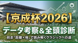 重賞 【京成杯2026】データ考察&全頭診断|前走「距離×格」で読み解く中山2000mの攻略法 京成杯2026のデータ考察と登録馬全頭診断。中山2000m攻略のカギは「前走の距離×格」と「コーナー加速力」。ジーネキング、ポルフュロゲネトスなど有力馬の現状評価と、過去傾向から狙える穴パターンを解説します。 2026.01.14 重賞