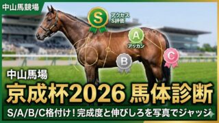 馬体診断 【京成杯2026】馬体診断S/A/B/C|写真で確認できた馬を格付け 京成杯2026(中山芝2000m)の馬体診断。写真で確認できた馬のみをS/A/B/Cで評価し、シルエット・筋肉の質・仕上がりから短評をまとめる(※ショウナンハヤナミは出走不確実のため対象外)。 2026.01.16 馬体診断