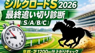 重賞 【シルクロードS 2026】最終追い切り診断(S/A/B/C)|京都芝1200mの仕上がりチェック シルクロードステークス2026の最終追い切りをS/A/B/Cで診断。坂路・CWの時計だけに頼らず、動き・余力・併せ内容と陣営コメントから仕上がりを整理。 2026.01.29 重賞