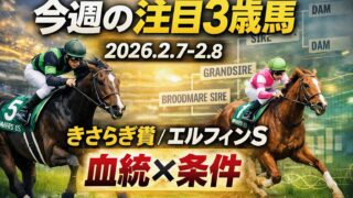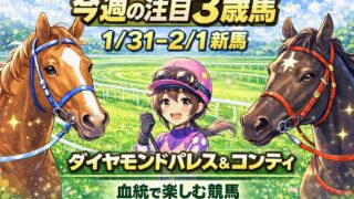 新馬戦 【今週の注目3歳馬】1/31-2/1 新馬戦の良血チェック|東京芝1800はダイヤモンドパレス&コンティ 1/31-2/1【2026年】に出走する注目3歳馬を、血統×条件適性×直前チェックで短評整理。東京芝1800はダイヤモンドパレス(兄ジャスティンパレス)&コンティなど人気馬に注目。 2026.01.31 新馬戦