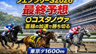 GIレース 【フェブラリーS2026】最終予想|◎コスタノヴァ|直線の加速で勝ち切る(東京ダ1600m) フェブラリーS2026(東京ダ1600m)の最終予想。最終追い切り診断・馬体診断・血統・近走成績・展開を総合評価し、◎コスタノヴァ本命で結論。対抗ダブルハートボンド以下、印と狙い方も整理。 2026.02.22 GIレース