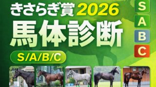 馬体診断 【きさらぎ賞2026】馬体診断|少数精鋭5頭をS/A/B/Cでチェック きさらぎ賞2026の馬体診断をS/A/B/Cで評価。掲載写真が確認できた5頭(エムズビギン/ゴーイントゥスカイ/サトノアイボリー/ゾロアストロ/コレオシークエンス)を、骨格・筋肉・バランス・可動域から整理。 2026.02.04 馬体診断
