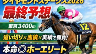 重賞 【ダイヤモンドステークス2026】最終予想|東京3400mを血統×追い切り×実績で結論 ダイヤモンドステークス2026(東京芝3400m)の最終予想。最終追い切り評価、近走成績、血統適性から注目馬を整理し、本命◎ホーエリート中心に印と狙いを解説。 2026.02.21 重賞