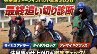 調教診断 【弥生賞ディープインパクト記念2026】最終追い切り診断|ライヒスアドラー・タイダルロック・アドマイヤクワッズの仕上がりをチェック 弥生賞ディープインパクト記念2026の最終追い切り診断。ライヒスアドラー、タイダルロック、アドマイヤクワッズを中心に、各馬の調整過程や仕上がりをわかりやすく解説。パントルナイーフ回避後のレース構図も整理します。 2026.03.06 調教診断