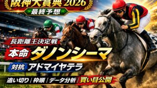重賞 【阪神大賞典2026最終予想】ダノンシーマ本命 長距離適性と上昇度を重視 阪神大賞典2026の最終予想を公開。考察記事、最終追い切り、近走成績、枠順、最新情報を踏まえて本命・対抗・穴馬を整理。ダノンシーマ本命、アドマイヤテラ対抗で買い目まで分かりやすく解説。 2026.03.22 重賞