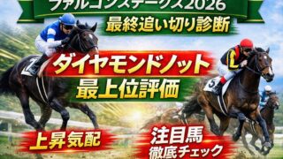 調教診断 【ファルコンステークス2026最終追い切り診断】ダイヤモンドノットが最上位評価 上昇気配の注目馬も徹底チェック ファルコンステークス2026の最終追い切り診断。ダイヤモンドノットを最上位評価に、メイクワンズデイ、カフェラバー、タマモイカロスなどの最新調教内容と上昇度を詳しく考察。中京芝1400m適性も踏まえて注目馬を整理します。 2026.03.20 調教診断