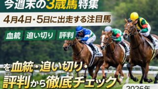 3歳馬 今週末の3歳馬特集|4月4日・5日に出走する注目馬を血統・追い切り・評判から徹底チェック【2026年】 4月4日・5日に出走する3歳馬の注目馬を特集。チャーチルダウンズカップのバルセシート、サンダーストラック、アンドゥーリルをはじめ、1勝クラス・未勝利戦の良血馬まで血統、追い切り、評判、戦績から詳しくチェックします。 2026.04.04 3歳馬