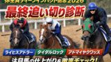 能力上位馬と上昇馬が入り混じる一戦だけに、最終追い切りの質は見逃せません。最終予想では枠順や馬場傾向も加味しつつ、トライアルらしい完成度の差を重視したいレースです。