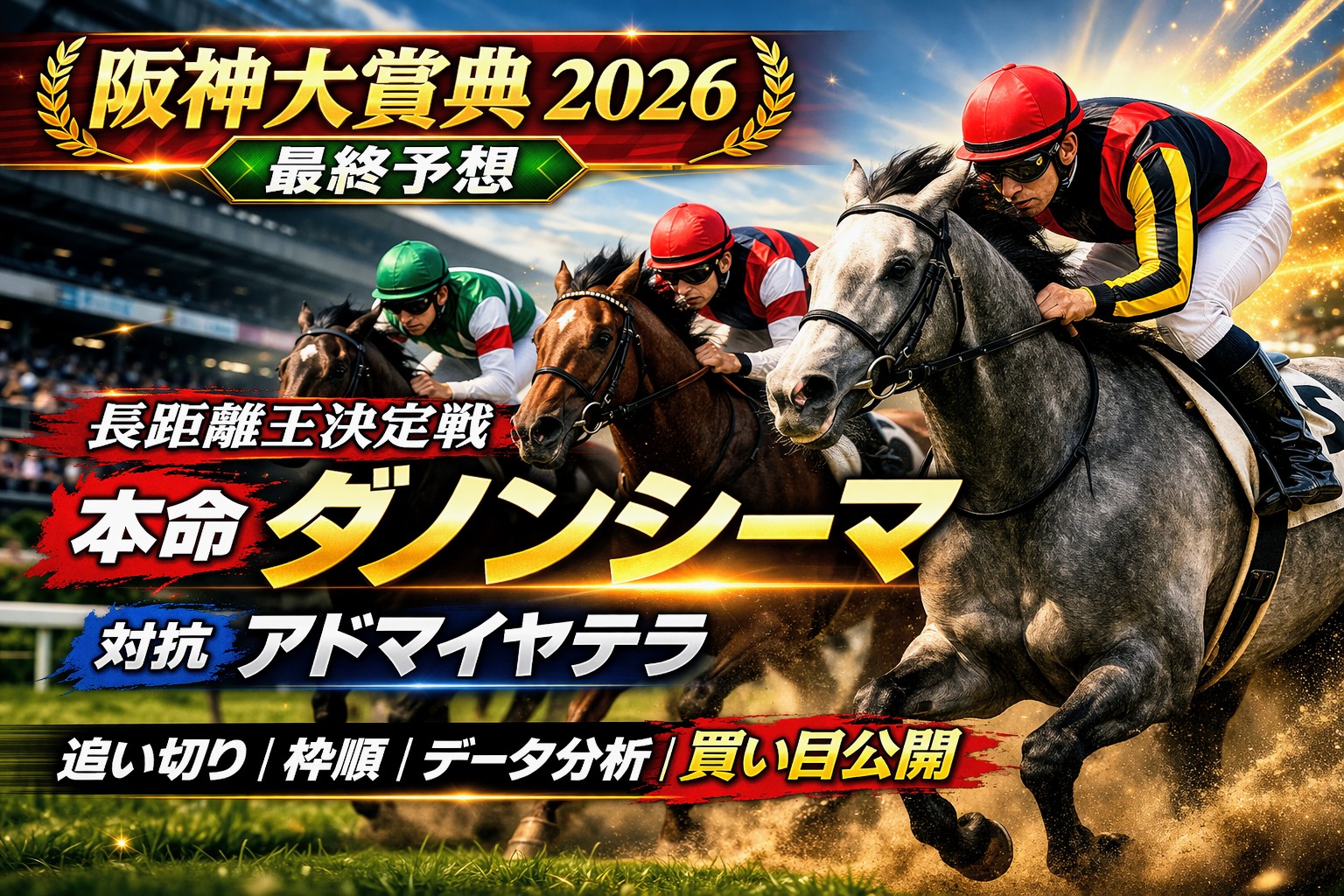 阪神大賞典2026の最終予想をまとめる。公開済みの考察記事、最終追い切り診断、近走内容、枠順、そして阪神芝3000mという舞台設定を踏まえて印を決定した。 今年は頭数こそ落ち着いたが、アドマイヤテラ、ダノンシーマ、レッドバンデ、マイネルエンペラーなど見どころの多いメンバー構成。 単純なスタミナ比べではなく、早めに動いて長く脚を使えるかどうかが勝敗を分けそうだ。