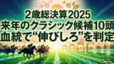 - 2歳は“王道路線の頂点(朝日杯FS/阪神JF)”の価値がそのまま反映されやすい。