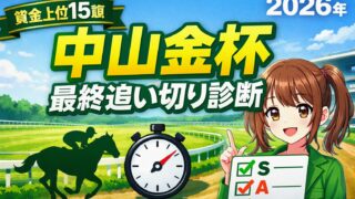 重賞 【中山金杯 2026】最終追い切り診断|賞金上位15頭をS/A/B/Cジャッジ 中山金杯(2026/1/4 中山芝2000m)の最終追い切りを、登録16頭のうち賞金上位15頭に絞ってS/A/B/C評価。追い切り時計とコメント要点を短く整理し、状態の良い馬を先に結論化。 2026.01.01 重賞