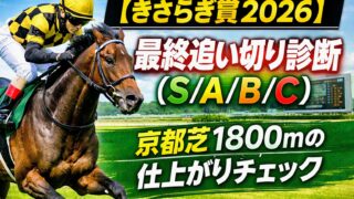 調教診断 【きさらぎ賞2026】最終追い切り診断(S/A/B/C)|京都芝1800mの仕上がりチェック きさらぎ賞2026の追い切りをS/A/B/Cで診断。CW・坂路・ポリの時計だけでなく、併せ内容や関係者コメントから“仕上がり”を整理。注目の上昇馬もピックアップ。 2026.02.06 調教診断