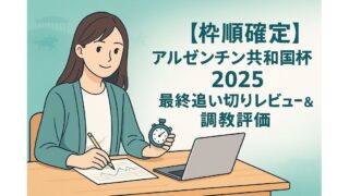 重賞 【枠順確定】アルゼンチン共和国杯 2025|最終追い切りレビュー&調教評価(S/A/B/C+スコア付き) 枠順確定後の最終追い切りレビューをスコア化。フォーム・良化度・相対時計など7要素でS/A/B/C判定。東京2500mの勝ち筋も簡潔に整理。 2025.11.07 重賞
