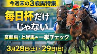 3歳馬 今週末の3歳馬特集|毎日杯だけじゃない 注目の良血馬・上昇株を一挙チェック 今週末の土日に出走する3歳馬を特集。毎日杯を中心に、君子蘭賞、ミモザ賞、大寒桜賞、未勝利戦まで注目馬を整理。血統、評判、近走内容から将来性の高い3歳馬を分かりやすく紹介します。 2026.03.28 3歳馬