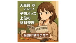 2025年天皇賞秋 【天皇賞・秋2025】枠順確定版|東京2000m×血統×脚質で“走りの型”を見極める 【天皇賞・秋2025】枠順確定版|東京2000m×血統×脚質で“走りの型”を見極める(現時点の考察) 第172回天皇賞(秋)— 2025年11月2日(日)東京・芝2000m。枠順が確定した段階で、コース特性(ポケット発走/長い直線)と各馬の... 2025.10.30 2025年天皇賞秋