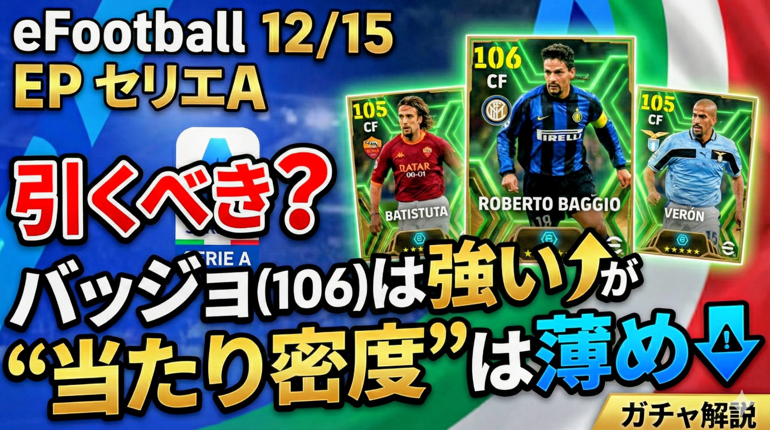 【イーフト】12/15(月)EP「セリエA」は引くべき?バッジョ(最大106)は強いが“当たり密度”は薄め|バティ/ベロン評価