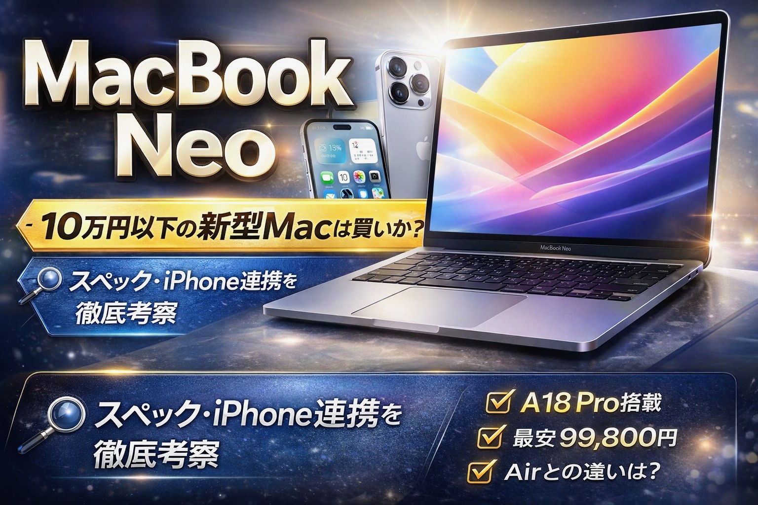 Appleが新たに投入した「MacBook Neo」は、これまでMacに手が届きにくかった層へ向けた“新しい入口”として非常にわかりやすい1台だ。 ただし、安さだけで飛びついていい製品でもない。この記事では、MacBook Neoの仕様を整理しつつ、MacBook Airとの違い、向いている人・向かない人、 そして日常ユースやiPhoneとの連携まで含めた実用性を丁寧に掘り下げていく。